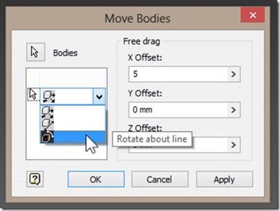 Once in the move command, click next to the ‘free move’ icon to reveal options to move your surface body along a ray or rotate it around an axis.