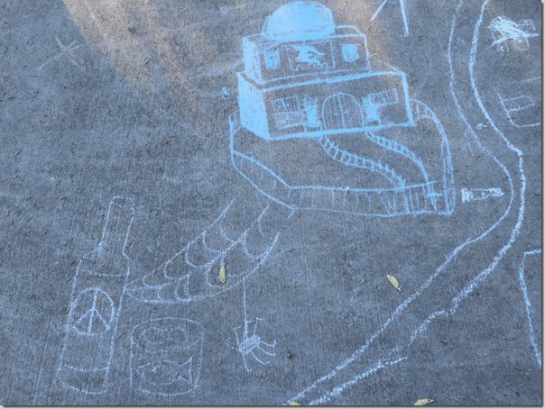 I was flying a UAS (unmanned aerial system aka drone) in Portland’s beautiful Mt Tabor park and noticed the chalk drawings on the surface I was using as a launch site. One was by a child who proudly put her name on it and the other obviously an adult and I will hopefully show how I deduced that.