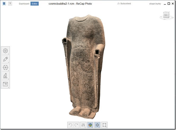 Using a minimum of 20 photos you can create a 3D textured model using Autodesk ReCap Photo. I sued 50 taken just walking around the Cosmic Buddha and uploaded them to ReCap Photo.