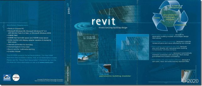 This BIMalicious historic entry is from my Autodesk history collection after I received every physical release of Revit from longtime Autodesk Research employee now Rick Rundell. Rick was with the Revit startup before Autodesk acquired them in 2002. I even have a Revit 1.0 short to proudly wear to special events.