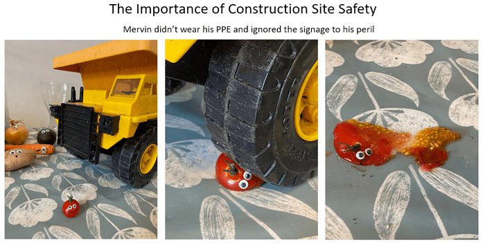 An Autodesk colleague Justin Taylor spent time teaching his 6 year old son the importance of construction site safety using a small tomato named “Mervin”.