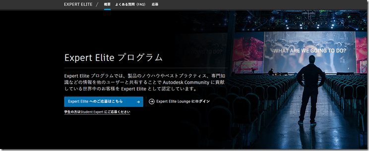 Expert Elite Site in Japanese プログラム https://www.autodesk.co.jp/expert-elite/overview Expert Elite プログラムでは、製品のノウハウやベストプラクティス、専門知識などの情報を他のユーザーと共有することで Autodesk Community に貢献している世界中のお客様を Expert Elite として認定しています。 Expert Elite へのご応募はこちら