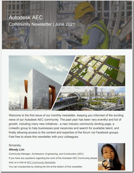 Autodesk AEC Community Newsletter - June 2021 EditionIf you are interested in the AEC Industry and the power of the Autodesk Community, this is a great resource quarterly by our Autodesk AEC Community Manager Wendy Lim. There is a plethora of information on top product solutions, resources, and information. The next newsletter comes out next month, so get signed up today!