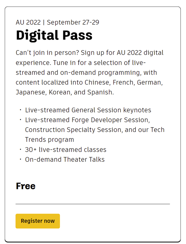 The Autodesk University 2022 free virtual passes for are now available in addition to the in-person registration to attend in New Orleans. While it is so much better in person, not everyone can make the trip this year so there is this option available.
