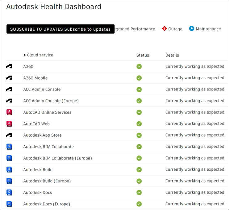Hopefully, you never need to use this, or have a service up issue, but in the off chance you need to check the current health status of an Autodesk Cloud Service there is the Autodesk Health Dashboard.